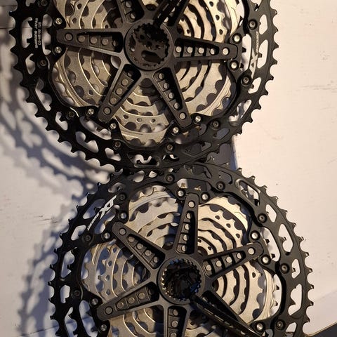 Denne cykelkassette består af flere tandhjul, bundet sammen med en snor. Tandhjulene er lavet af metal og designet til at være en del af gearsystemet på en cykel. Den har ingen synlige skader og ser robust ud, klar til at blive monteret på en cykel.