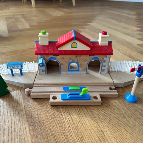 BRIO World Grand Roundhouse tog remise til BRIO togbane. Modellen er udformet som en stor rundremise med flere porte til opbevaring og parkering af tog og togvogne. Remisen har detaljerede vægge, døre og tag samt integrerede spor i bunden, der passer til BRIOs trætogssystem. Velegnet som udvidelse af eksisterende BRIO togbane til leg med tog for børn fra ca. 3 år.