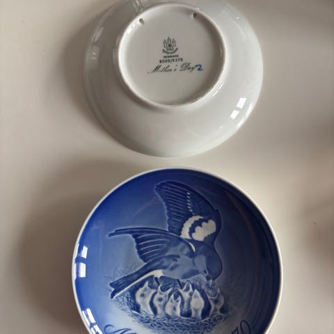 Porcelænstallerken med en diameter på 15 cm, der har en bemærkelsesværdig blå inderside med et dekorativt mønster. På ydersiden af tallerkenen står der trykt 'Mors Dag 1977', hvilket antyder, at det er en samlerobjekt eller en speciel udgave. Bagsiden af tallerkenen har et stempel, der viser 'B&G' og kan indikere, at det er en Bing & Grøndahl porcelænstallerken. Der er også en lille metaltråd bagpå, som gør det muligt at hænge tallerkenen som dekoration. Tags: porcelæn, samlerobjekt, dekoration, morsdag.