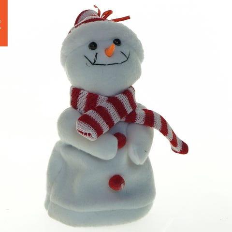 En lille snekugle med en figurskulptur af en snemand i midten. Den transparente kugle er placeret på en firkantet hvid base. Kuglen indeholder rød og gul dekoration, som ligner sne, der omgiver figuren. Basen har fire små beskyttelsesfødder i bunden for at forhindre skader og skrid. Størrelsen af kuglen inklusive basen er 8x5 cm.