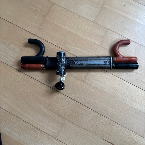 Denne genstand er en ratlås designet til at forhindre biltyveri ved at blokere styringen af bilen. Den har en gul håndtag og en grå metaldel, der kan monteres på rattet. Ratlåsen kommer med en nøgle, hvilket gør den let at låse og oplåse. Størrelsen på låsen er 40 cm. Tags: ratlås, bilsikkerhed, biltyveri.