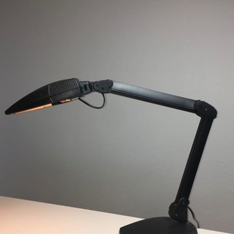 Ny Luxo Calypso lampe, som leveres i en original emballage med instruktioner. Lampen har et sort design med en ledning og monteringsbeslag inkluderet. Lampen kan justeres i flere retninger, i henhold til de medfølgende instruktioner, og er ideel til brug som bordlampe til optimal belysning ved arbejde eller læsning.