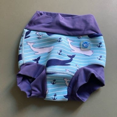 Baby svømmeblebukser i rosa og blå farver med et dyremønster.