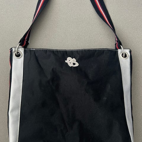 En praktisk taske med sort og sølv farve. Tasken har en bred, justerbar skulderrem og fold-over top for nem adgang. Fronten prydes af et designmærke, og tasken lukkes med velcro.