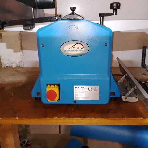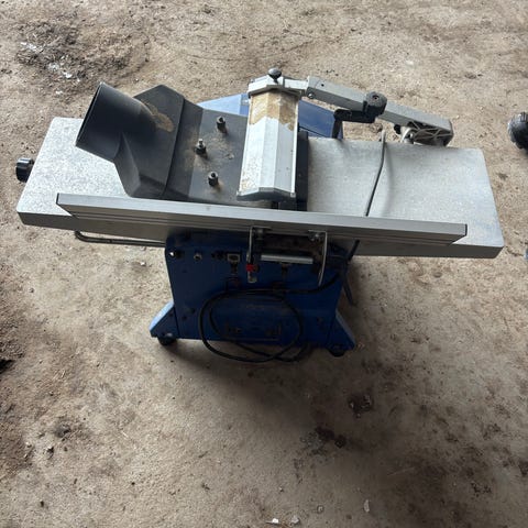 Scheppach HT850 tykkelseshøvl. Stationær maskine til bearbejdning af træemner, hvor emnerne føres gennem maskinen for at opnå ensartet tykkelse. Maskinen har betjeningsknapper placeret på fronten. Velegnet til træarbejde i værksted eller hobbybrug, hvor der er behov for præcis afretning og tykkelseshøvling af brædder og planker.