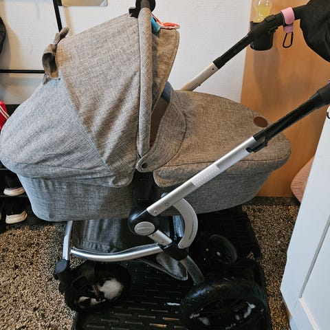 Super god klapvogn til alt terræn. Håndtaget kan vendes begge veje. Sædet kan ligges helt ned og solskærmen kan komme ret langt ned også.