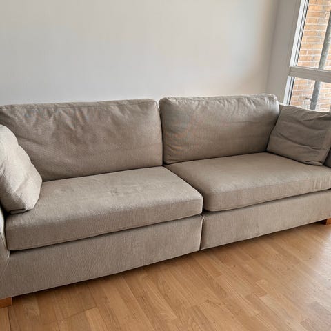 Lysegrå sofa fra Ikea, som har været brugt i en god del år, men er stadig rigtig fin. Har synlige spor og pletter, så en tur i vasken er nok godt