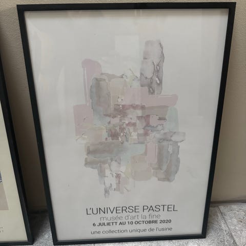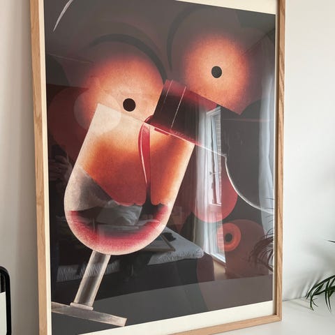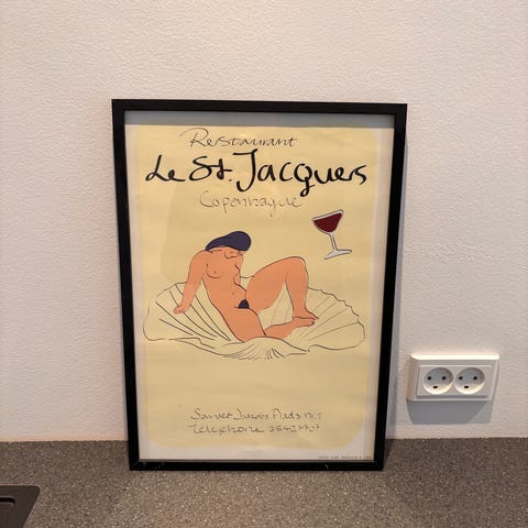 Restaurant Le St. Jacques plakat med illustreret motiv af person i muslingeskal og vinglas. Rammen kan fås med gratis