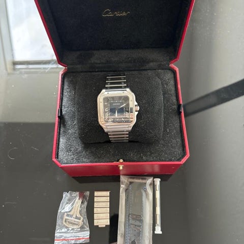 Kassen i rustfrit stål og de synlige skruedetaljer på bezel og lænke giver uret et ikonisk og genkendeligt look, som har gjort Santos-serien til en klassiker i urverdenen. De elegante visere og tydelige timemarkeringer sikrer optimal læsbarhed og understøtter urets sofistikerede æstetik.