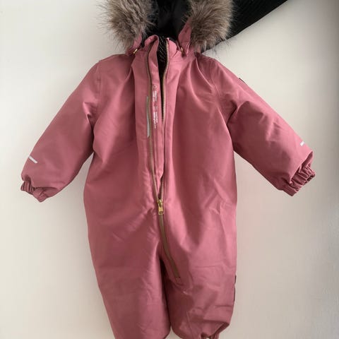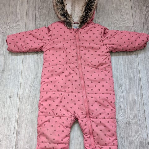 Sød og velholdt lyserød flyverdragt i størrelse 62–68, passer ca. 2–6 måneder. En praktisk og fin dragt til trilleture og hverdagsbrug.