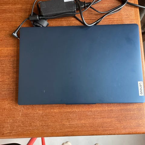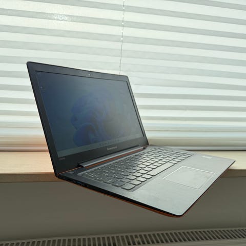Lenovo bærbar computer med ca. Kabinettet er orange udvendigt med lys inderside og sort tastatur.