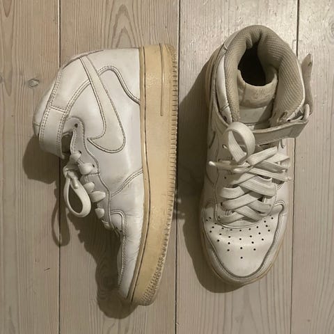 Nike Air Force sneakers til børn, unisex, i str. 37,5 Skoene er overvejende hvide med sorte og lysegrå detaljer samt snørelukning. Overdelen er i glat materiale med perforeringer ved tæerne for ventilation, og sålen er kraftig med mønster for bedre fodfæste. Egnet som hverdagssko til skole og fritid.