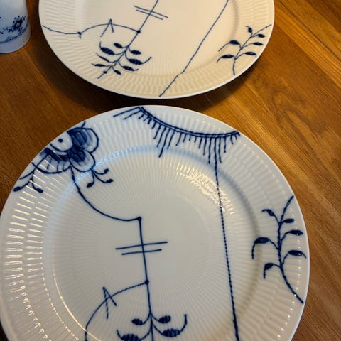 Elegant porcelæn fra Royal Copenhagen sælges – en eksklusiv kombination af klassisk hvid samt det ikoniske Blå og Sort Mega Riflet design. Perfekt til en stilren borddækning med personlighed og dansk designarv.