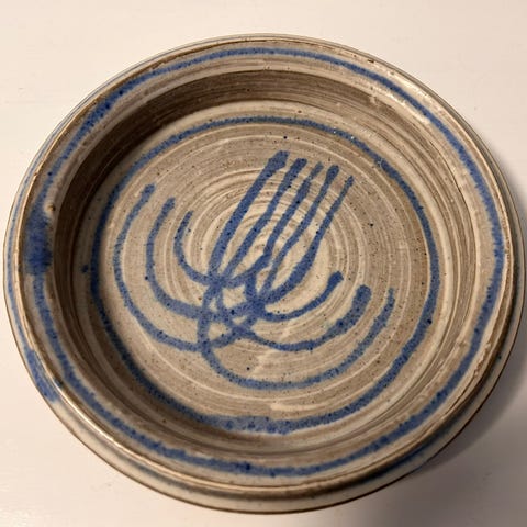 Dybdal 1930. Stentøjsfad med hanke i brændt brun stentøj. Indersiden er dekoreret med gule bladformede felter på blålig bund.