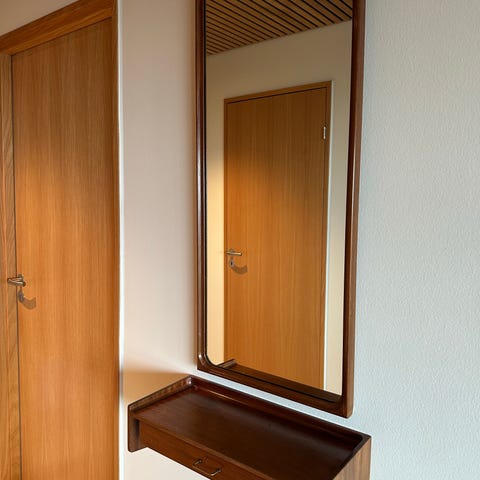 Flot entresæt med skoreol i fyrretræ og hængespejl med udskårne detaljer. Formentlig fra 1970erne.