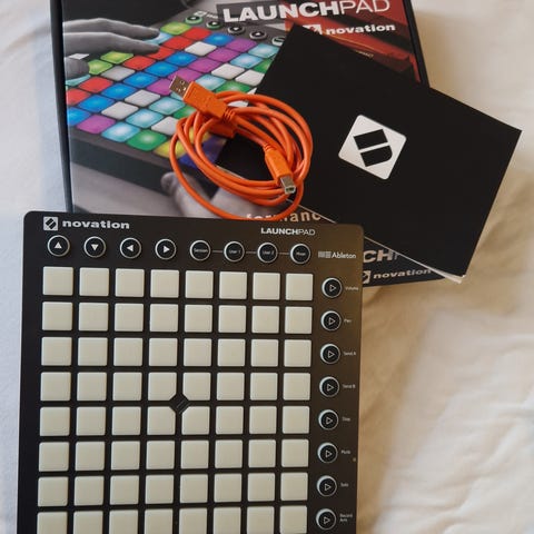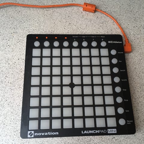 Novation Launchpad Mini MIDI-controller i sort. En kompakt pad-controller med et grid af trykfølsomme knapper, velegnet til styring af musiksoftware og klip-lancering. Enheden er designet til brug sammen med Ableton Live, men kan også anvendes med anden kompatibel musiksoftware via USB-tilslutning.