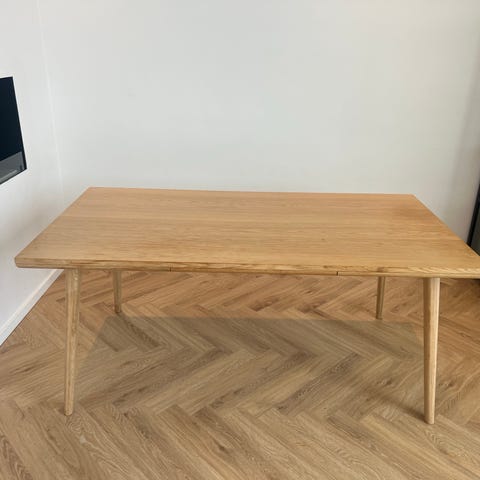 FDB Møblers C35BH Spisebord med hollandsk udtræk, i lakeret egetræ. Bordet måler 160 cm. lang i stående mål og kommer helt op på 270 cm. fuld udslået. Bordet har ikke tidligere været i brug, men sælges billigere da der er et lille gab imellem bordpladerne som kan ses på billederne. Andre mindre kosmetiske fejl kan forekomme.