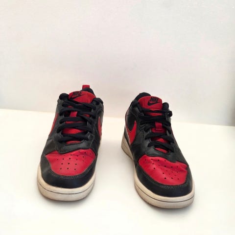 Nike sneakers i str. 40 til unisex. Skoene er i rød og hvid med sorte snørebånd og Nike-logo på siden. Modellen er højskaftet og egner sig til hverdagsbrug og fritidsaktiviteter. Overdelen er i syntetisk materiale og tekstil, og sålen er i gummi for bedre greb.