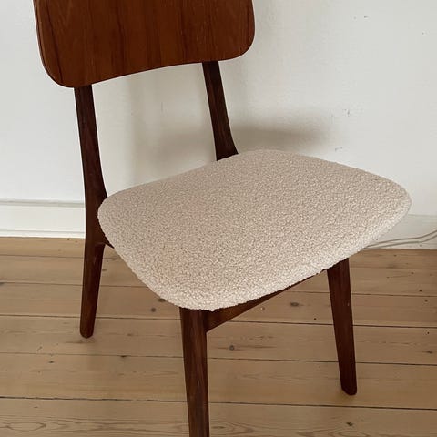 Jeg sælger et samlet sæt på 9 klassiske teaktræsstole med formspændt sæde/ryg og metalben. Stammer fra en fabrikskantine.
