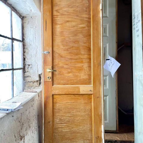 Original fyldningsdør med to felter og enkle profiler. Med original karm (og uden bundstykke).