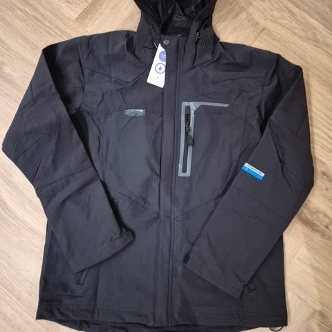 Jakken er sort og fremstillet i polyester. Den har gennemgående lynlås foran, hætte og elastik ved ærmeafslutningerne.
