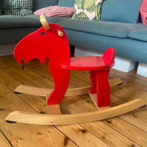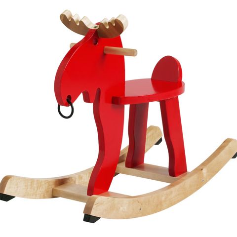 IKEA gyngehest formet som et lam i lyst træ med hvidt, blødt betræk. Gyngehesten har træstel med meder og håndtag, som giver stabilitet under brug. Egnet som legetøj til mindre børn, der kan sidde selv og gynge frem og tilbage. Overfladerne er glatte træflader kombineret med tekstil, som kan give en blød siddeoplevelse. Kan anvendes indendørs på jævnt underlag.