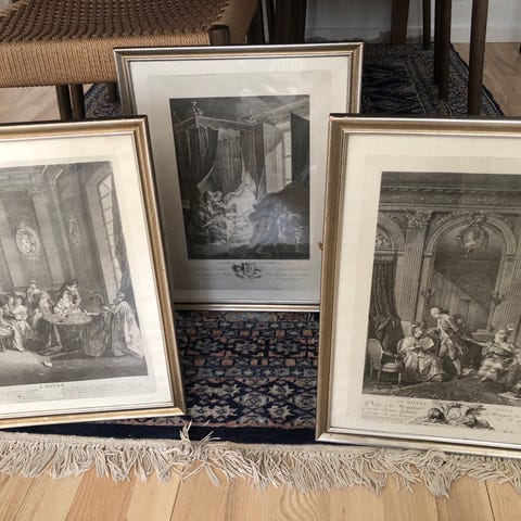 Sæt med to indrammede billeder (kobberstik) af ukendt kunstner. Motiverne viser udendørs scener. Begge billeder er monteret i ens, profilerede rammer med passepartout. Egnet til ophængning i stue, gang eller kontor som klassisk vægudsmykning.