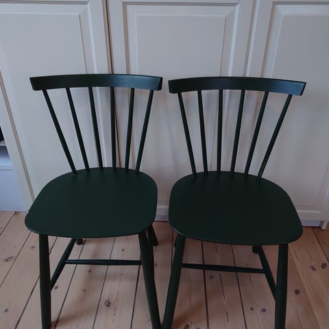 Sælger 6 stk. originale FDB J46 spisebordsstole tegnet af Poul M. Volther. Stel i bøg, malet i støvet grøn/petroliumsgrøn.