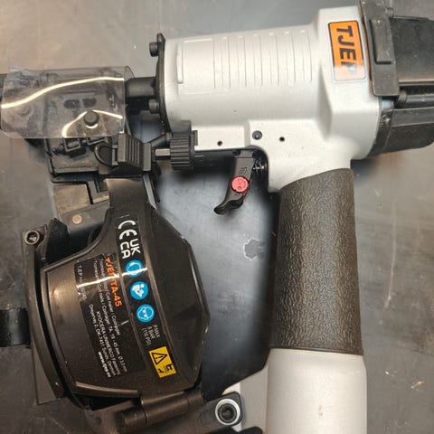 TJEP TA 45 tromlesømpistol leveres i hård plastkuffert med indlæg til maskine og tilbehør. Modellen er beregnet til brug med tromlesøm i længder fra 19 til 45 mm og har en vinkel på 15°. Velegnet til forskellige tømrer- og konstruktionsopgaver, hvor der kræves hurtig og gentagen sømning med tromlesøm.