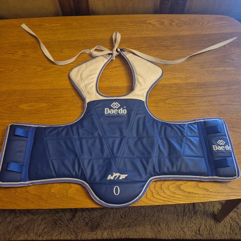 Budo-Nord taekwondo kampvest i størrelse S. Beskytteren er vendbar med rød side på den ene side og blå side på den anden.