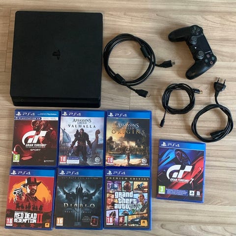 Sony Playstation 4 Pro konsol i sort. Konsollen ses sammen med fire DualShock 4 controllere i forskellige farver samt et udvalg af PS4-spil og kabler. .