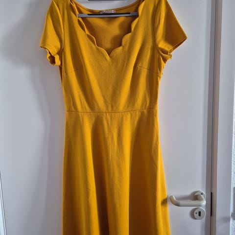Anna Field hverdagskjole til kvinder i størrelse L. Kjolen er grøn og fremstillet i polyester. Modellen har V-udskæring, korte ærmer og knælang pasform. Lynlås i ryggen og enkle læg foran og bagpå giver et klassisk og enkelt udtryk. Velegnet som hverdagskjole eller til mere formelle anledninger.