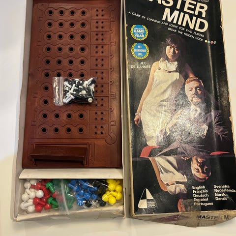 Mastermind brætspil. Klassisk logik- og kodebrydningsspil, hvor den ene spiller laver en farvekode med brikker, og den anden forsøger at gætte koden ved hjælp af ledetråde.