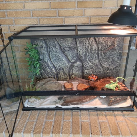 Exoterra terrarie på 90 bred, 30 høj og 45 dyb sælges der medfølger varmemåtte og vandskål og led lys. Skal afhentes i Vester hornum ved Farsø