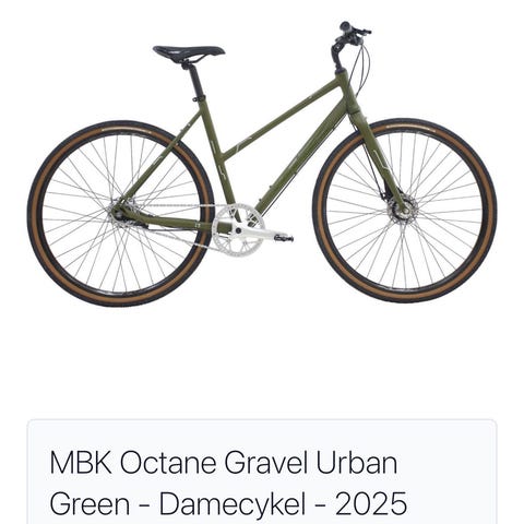 MBK Octane Gravel Urban dame hybridcykel i størrelse S med 28" hjul. Cyklen har lavt skrårør, der gør den egnet til kvinder. Farven er grøn med kontrastfarvede dækkanter. Hybridudformningen gør cyklen velegnet til både bykørsel og længere ture på blandet underlag. Cyklen er udstyret med fladt styr og sadel til oprejst kørestilling samt skivebremser. Stellet er designet til 28"/700c hjul, hvilket giver god rulleevne på asfalt og fast underlag.