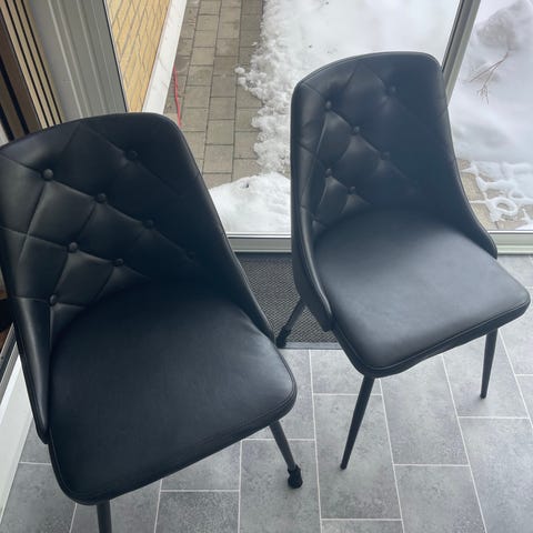 Rigtig god siddekomfort. Seriøse bud modtages gerne. Ligner læder men tror det er noget andet:-). Meget let at vedligeholde kan nemt tørres af. Vi har 12 stk. sælges minimum 6 stk. pr. handel (Gerne alle på en gang) Kan hentes i Jægerspris eller Jyllinge. Kan evt. levere mod en merpris:-)