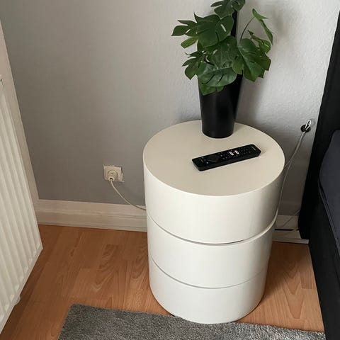 Ilva rundt natbord med opbevaring i hvid. Natbordet har en cylindrisk form med drejelige opbevaringsrum, der giver plads til mindre genstande som bøger, briller eller legetøj. Overfladen kan anvendes til lampe eller andre ting ved siden af sengen. Velegnet som natbord i soveværelse eller som lille sidebord i andre rum. Hvid lakeret H 51 x Dia 40 cm.