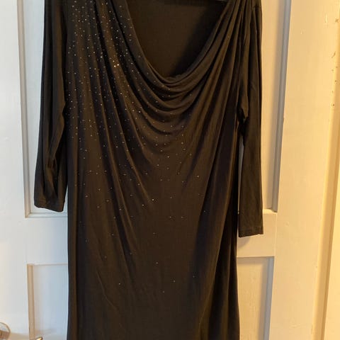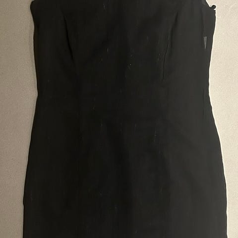 H&M fest- og cocktailkjole i sort. Kjolen er i str. 38 og fremstillet i polyester. Modellen har lynlås foran og let rynkeeffekt i stoffet, som giver et draperet udtryk. Velegnet som festkjole eller til andre anledninger, hvor en enkel sort kjole ønskes.