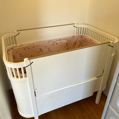 Senge rand fra MINI MOW - betrækket er fremstillet af økologisk bomuld og fyldt med genbrugspolyester og giver et blødt touch til dit barns tremmeseng.