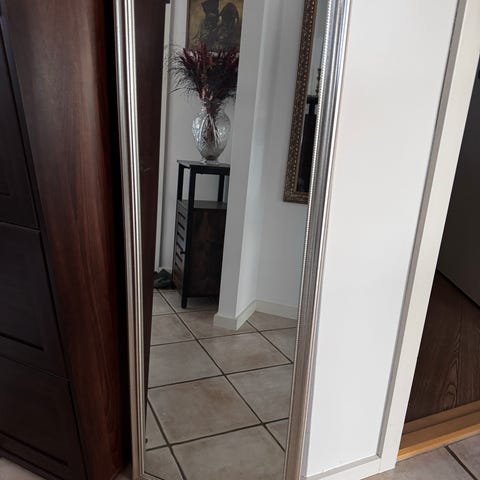 Spejl med sølv ramme. Kan hænges lodret eller vandret efter behov. Ingen tydelige ridser