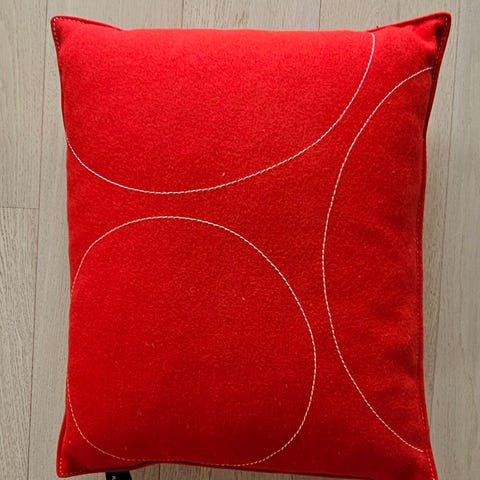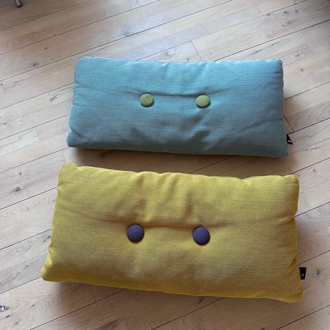 Hay pude i rektangulær form i rosa stof. Puden har to knapper på forsiden og på bagsiden. Fin som pyntepude i sofa, lænestol eller på seng.