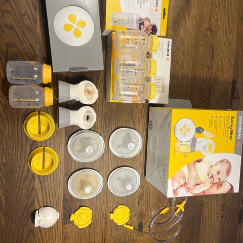 Medela Swing Maxi elektrisk brystpumpe med tilhørende flasker og tilbehør.