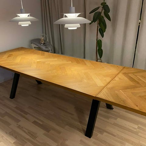 Super flot og velholdt spisebord i egetræsfiner med sildebensmønster. Bordet er oliebehandlet og fremstår i rigtig pæn stand. Tillægsplade medfølger.