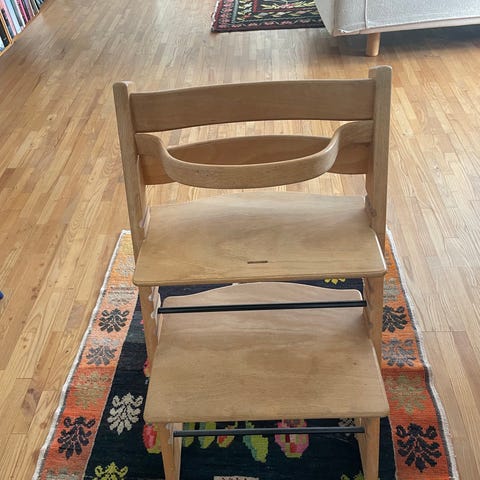 Stokke Tripp Trapp højstol i egetræ. Højstolen har justerbar siddeplade og fodplade, som kan tilpasses barnets højde. Egnet til brug ved spisebord eller som siddeplads til børn i forskellige aldre. Klassisk design med træramme og metalstøtter under pladerne for stabilitet.