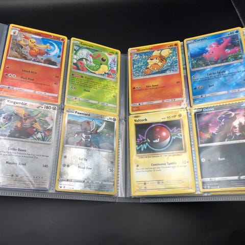 Mappen indeholder forskellige Pokémon-kort, herunder basis-Pokémon, udviklede Pokémon samt trænerkort.