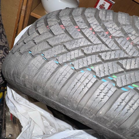 Hjulene har været monteret på en Ford Fiesta fra 2020. Der er ca 5mm mønster på alle dæk. 2 af dækkene har rejst sig en smule i mønsteret. Vil vurdere der er til en sæson mere.