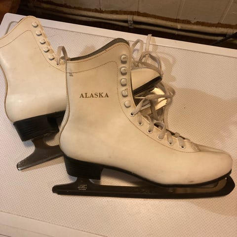 Hvide Alpine kunstskøjter, hvide snørebånd. lille hæl, skøjtebeskyttere, str. 41. Pris: 300,-kr.