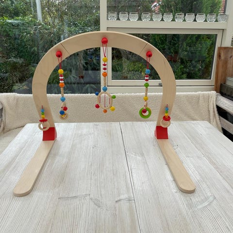 Din baby ligge på ryggen og række ud efter de farverige figurer.