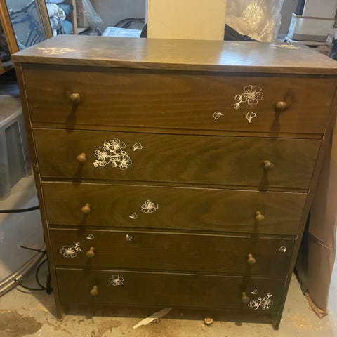 Herlig gammel kommode med 4 skuffer, malet så det passer til ethvert pigeværelse.