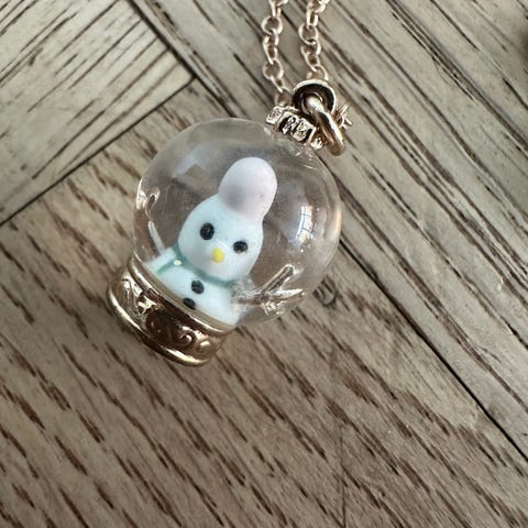 Sød julehalskæde med tre charms: snemand, snefnug og juletræ, emaljerede og med rhinstene. Halskæden måler 41 cm, og kan forlænges med 7,5 cm.